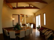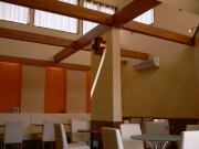 奥の壁、オフホワイトに強いオレンジ色が目に鮮やか。これだけで、店内が引き締まった印象に。 | 高い位置に窓を大きくとっているので、店内はとても明るい。 | 角度を変えて見ても、店内は落ち着ける空間。 間接照明の力です |