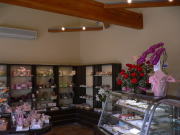 焼き菓子も販売。 こげ茶色の棚が華やかなディスプレイを引き立てます。 |